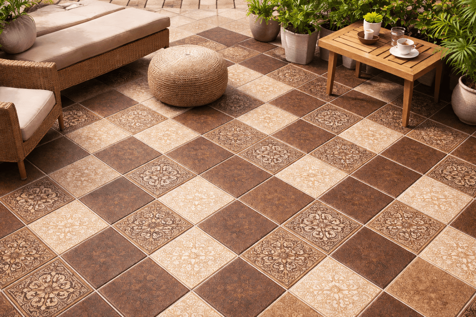 現代人對戶外空間的要求已不只是功能性,也希望能營造舒適、有品味的生活氛圍。像是偏鄉村感、自然感或懷舊感的設計,就很適合搭配復古風格的止滑磚,讓空間更有層次與特色。