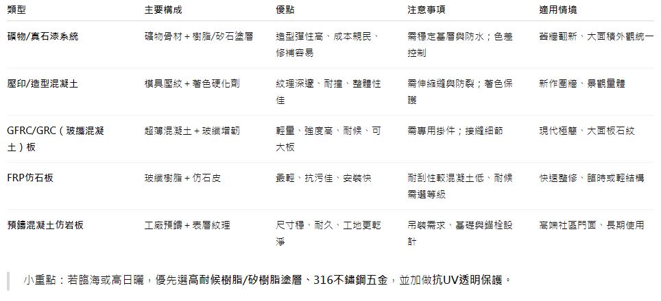 仿岩藝術圍牆的關鍵不是單一塗料或板材,而是「選材+基礎+防水+收邊+維護」的一整套。