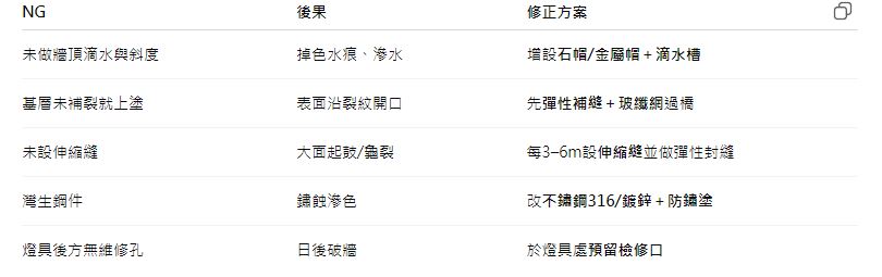 - 牆頂必做滴水導角+1–2%外傾斜;縱向留排水孔避免積水鼓爆。