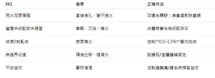 - 每年:檢視低點溢流與邊界收邊是否鬆動、基層是否沉陷並補修。